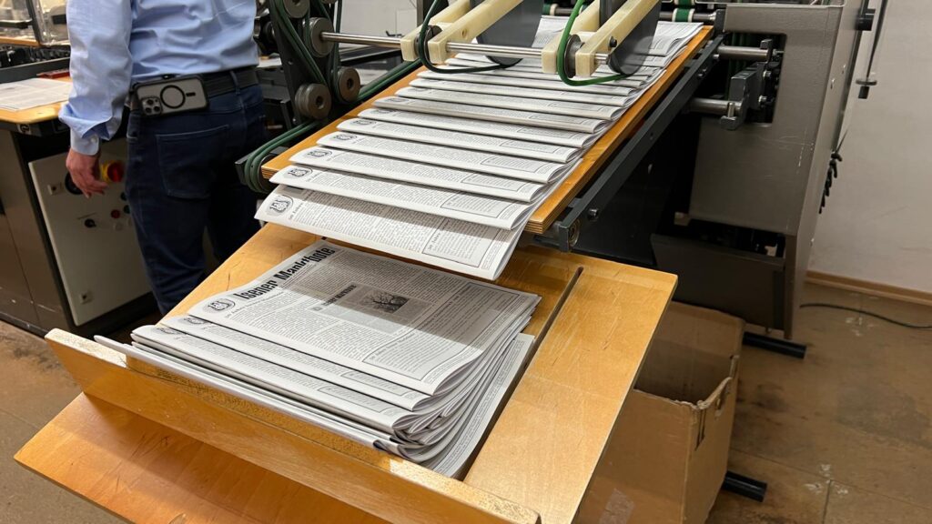 Franz Nußrainer führte die Besucherinnen und Besucher, unter ihnen auch Erste Bürgermeisterin Irmgard Hibler, durch die Produktionsräume und erklärte anschaulich die einzelnen Arbeitsschritte – von der Druckvorstufe bis zum fertigen Exemplar. Zwischen Offsetmaschinen, Papierstapeln und Druckplatten wurde deutlich, mit wie viel handwerklicher Präzision und Engagement der Marktbote seit 1975 entsteht.