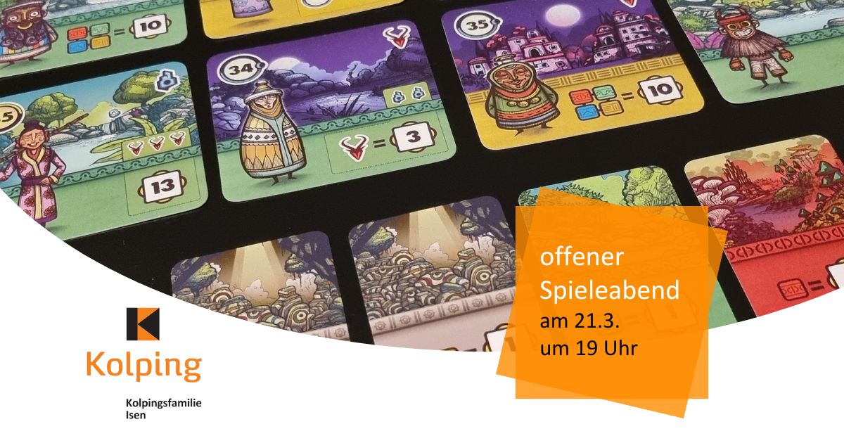 Brunauerhaus, St.-Zeno-Platz 5, IsenAm Samstag, 15. August um 19 Uhr laden wir wieder zu einem gemütlichen Spieleabend in unserer Kolping-Stube im Brunauerhaus ein. Eingeladen sind alle, die gern Brett-, Würfel- und Kartenspiele spielen – egal, ob Mitglied bei Kolping oder nicht. Der Eintritt ist frei. Wir haben immer eine Auswahl an Spielen mit dabei, gern könnt ihr aber […]